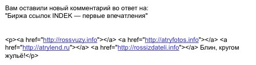 Вроде все чинно и благородно, негодует человек, можно простить бессмысленный комментарий. Но в исходном виде этот же комментарий выглядит несколько иначе — spam detected!